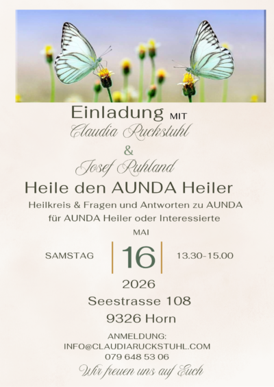 Oder nutze den Heilkreis mit mir persönlich und teils mit Josef Ruhland, den wir einmal im Monat in Horn/TG anbieten. Das ist stets ein wunderbares Wiedersehen mit vielen aus der AUNDA Lehre. Sei von Herzen willkommen, auch dann, wenn du noch nie etwas von AUNDA gehört hast.