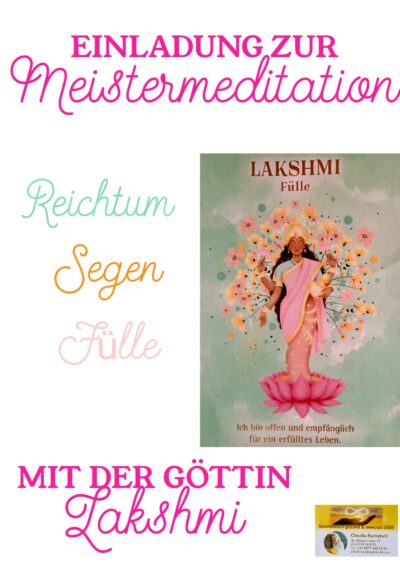 Im Monat April meditieren wir mit Göttin Lakshmi. Sei von Herzen mit dabei. Es wird spannend. Wer sich über WhatsApp oder Mail mit E-Mail-Adresse und Mobile Nr. angemeldet hat, erhält vertiefte Infos zur Göttin Lakshmi und/oder geführte Meditation zusätzlich.